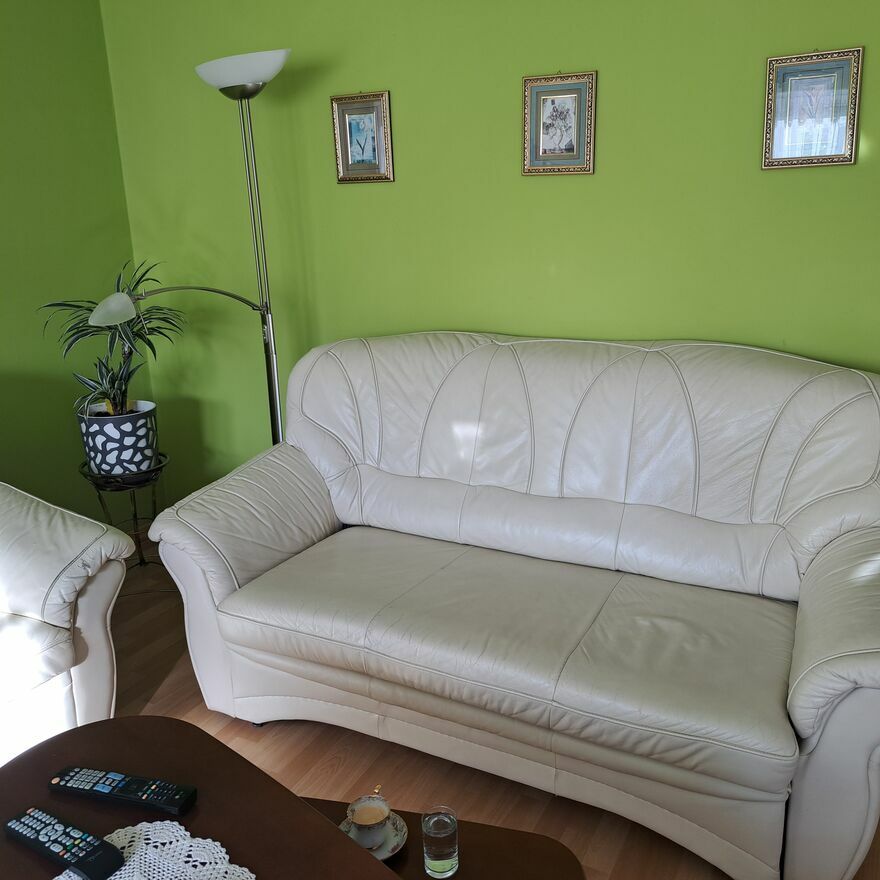 Sofa z możliwością spania plus 2 fotele, ze skóry naturalnej, kolor ecru.Stan dośc dobry, na bocznym oparciu jednego fotela nieduże przetarcie skóry.
